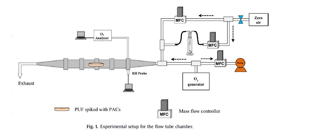 該裝置由三個(gè)輸送的氣流組成進(jìn)入流量管: (1) 由臭氧發(fā)生器產(chǎn)生的 O3, (2) 用于稀釋的零空氣由零產(chǎn)生空氣源(AADCO 737 型),以及 (3) 由將零空氣通過(guò)裝有去離子的洗氣瓶水。 O3 濃度由臭氧分析儀監(jiān)測(cè)(Model 205, 2B Technologies, CO)。一個(gè)探針被用來(lái)測(cè)量流管室中混合物的相對(duì)濕度 (RH)。這PUF 暴露約 4.5 小時(shí),平均 O3 濃度為~40 ppm(總流量為 11 LPM)和 ~14 ppm(總流量為 4 LPM)在分別為 0% RH 和 50% RH。在 0% RH 和 50%RH一式三份進(jìn)行。在這兩種情況下,總 O3 濃度大約相當(dāng)于將 PUF 暴露在兩個(gè)月的環(huán)境 O3 濃度約為 50 ppb。干凈的空白過(guò)濾器也放置在流量管中并暴露于 O3 約 4.5 小時(shí)測(cè)試背景污染。結(jié)果表明,有流量管系統(tǒng)中沒(méi)有明顯的 PAC 污染或?qū)嶒?yàn)室。