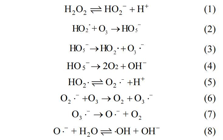 水 本文研究了在恒定臭氧濃度(84mg/L)下,不同H2O2投加量(以 30%濃度的 H2O2溶液計)對焦化廢水 COD 去除效果的影響.投加 H2O2 顯著地促進了O3/TiO2-NF對 COD 的去除(圖 2a),當 H2O2投加量為5g/L 時,O3/TiO2-NF/H2O2 工藝(60min)的 COD 去除率 63.6%,是 O3/TiO2-NF 工藝(25.8%)的 2.5 倍.此外,圖 2b 還顯示 H2O2 投加量從 0.1g/L 增加到5g/L,COD 去除動力學(xué)常數(shù)從 6.55×10-3min-1 增加到 2.21×10-2min-1,提高了約 3.4 倍.這是因為投加H2O2 促進了 O3 均相轉(zhuǎn)化為羥基自由基.由于 HO2-與 H2O2 解離平衡(式(1),pKa=11.8)[19], H2O2 通過解離產(chǎn)生 HO2-,其會與 O3 分子發(fā)生快速鏈式反應(yīng)(式(2),二級反應(yīng)動力學(xué)常數(shù) - HO ,O2 3k = × 9.6 6 10 mol/(L s) ⋅ ,產(chǎn) 生 HO2•和 O3•,在進一步生成強氧化劑·OH[20],如式(3~8)所示.