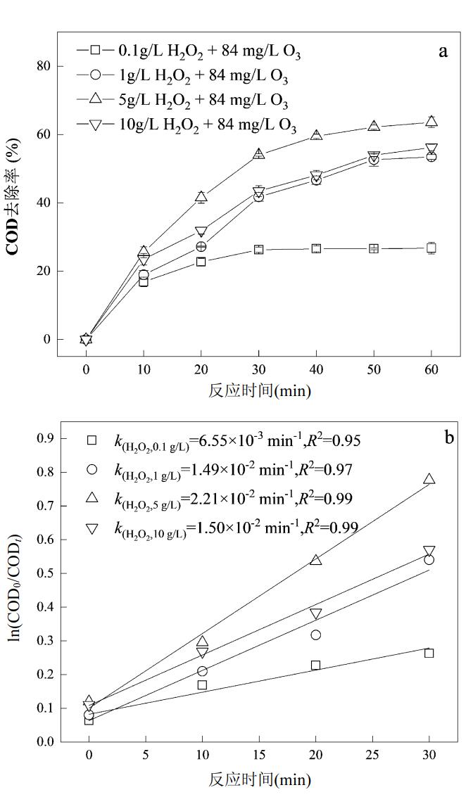 圖 2 不同 H2O2投加量下,O3/TiO2-NF/H2O2工藝對焦化廢水COD的去除率(a)和COD去除動力學(xué)(b)