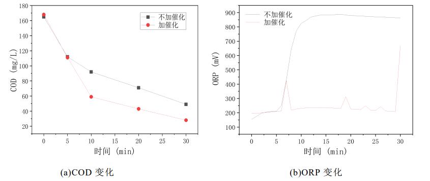 投加雙氧水催化氧化與單獨臭氧氧化實驗結(jié)果表明,投加催化劑有更佳的去除效果,不加催化劑去除率為 70.3%,加催化去除率為 83.3%,30min 投加催化劑的出水 COD 為 28mg/L,達(dá)到地表Ⅳ類水標(biāo)準(zhǔn)。且雙氧水與反應(yīng)符合式 ,促進(jìn)產(chǎn)生羥基自由基且不引入其他金屬離子,符合過膜要求。