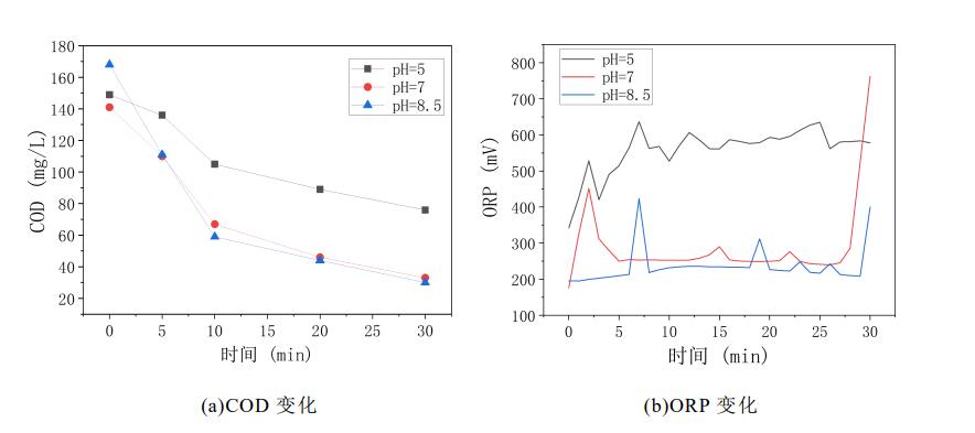 圖2。由結(jié)果可以看出,隨著臭氧投加量不斷升高,COD 持續(xù)下降,ORP 的值也顯著增加,是由于臭氧的不斷溶解,使水中的氧化性上升,導(dǎo)致氧化還原電位增強。在約為10min 時 ORP 值趨于平衡,說明水中的溶解臭氧已達(dá)到飽和,此時水中將不能溶入更多的臭氧,通入的多余臭氧氣體會造成不必要的浪費。pH 隨著臭氧氧化水中溶解有機(jī)質(zhì)不斷產(chǎn)酸,導(dǎo)致 pH 下降。