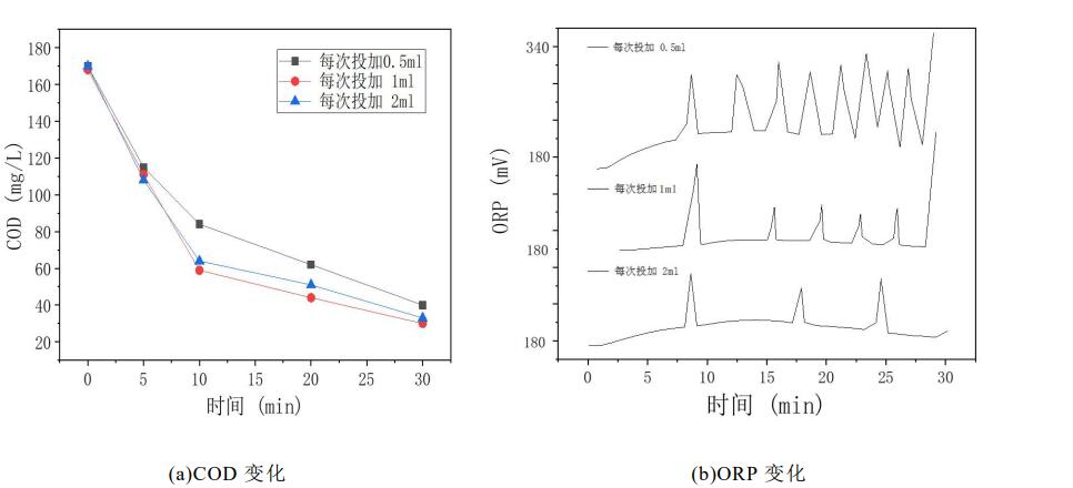 可以看出,三種以 ORP 值投加催化劑的過程中原水的臭氧反應(yīng)時間基本相似,都在約 9min 處臭氧飽和,完成臭氧的直接反應(yīng)。9min 后多余的臭氧與過氧化氫結(jié)合,生成羥基自由基,繼續(xù)進(jìn)行對污染物的無選擇性攻擊。三種不同的劑量投加中,每次投加 0.5、1、2ml 對應(yīng)的總藥耗分別為 4.5、5、6ml,由圖可知,每次投加 1ml 時的去除 COD 更多。從經(jīng)濟(jì)性與處理效果方面來看,當(dāng) ORP 達(dá)到峰值后每次投加 1ml 過氧化氫的投加計量是更優(yōu)的