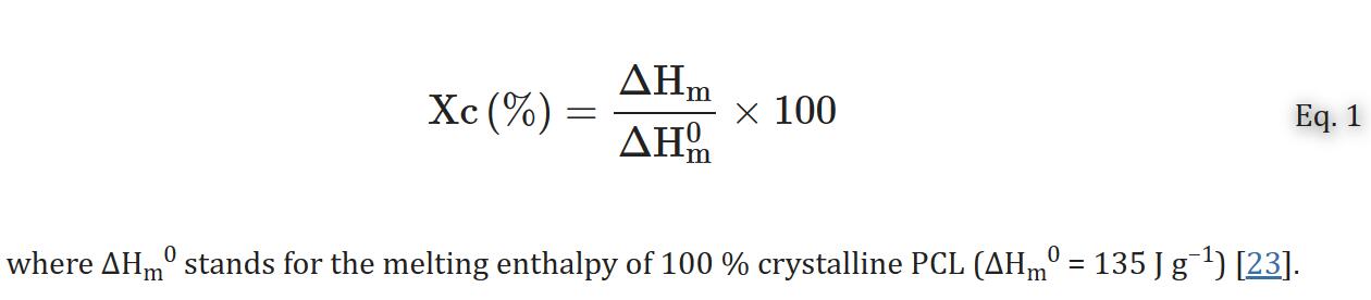 差示掃描量熱法 (DSC) 分析在氮?dú)鈿夥障率褂?131 Seratam Instrumentation 量熱儀進(jìn)行。針對(duì)每種薄膜條件分析兩個(gè)樣品。在25至200°C的加熱速率下,以10°C的很小加熱速率掃描樣品一次−1.熔融溫度(Tm)和熔融焓(ΔHm)的PCL是從第一次掃描中確定的;熔化溫度取于峰值的很大值。此后,在−100至25°C的加熱速率下,以10°C的很小加熱速率對(duì)樣品進(jìn)行兩次掃描−1.玻璃化轉(zhuǎn)變溫度(Tg)在第二次掃描的中點(diǎn)確定。結(jié)晶度 (Xc) 使用公式 1 計(jì)算: