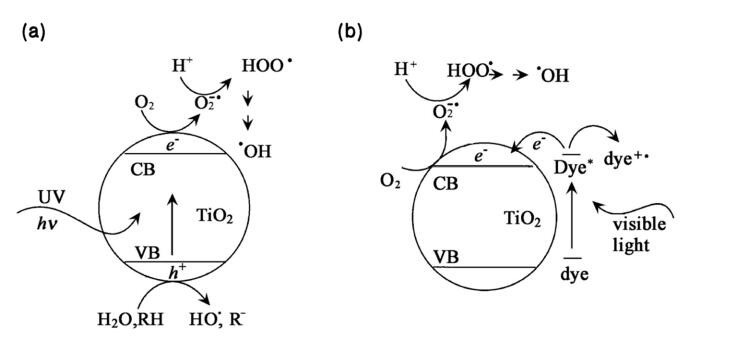 ?圖1所示。紫外(a)和可見光(b)下TiO2光催化氧化反應(yīng)機(jī)理圖[47]。