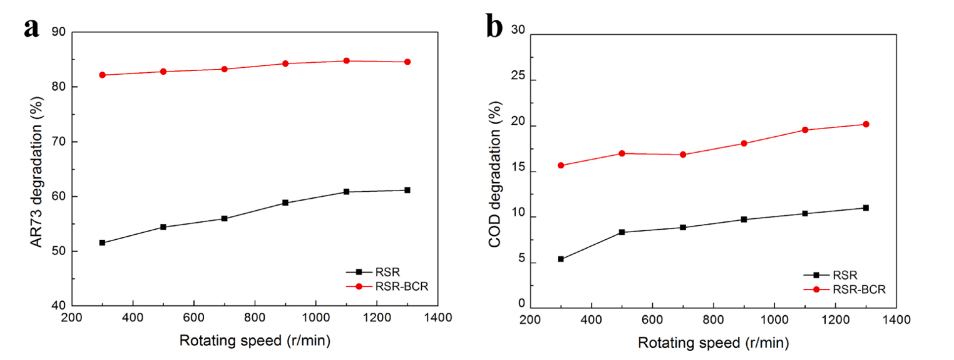 圖2所示。轉(zhuǎn)速對(duì)a) AR73降解效率的影響;b) COD降解效率。