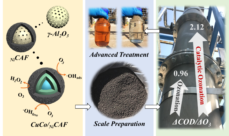 在催化臭氧化過程中,Al 2 O 3負(fù)載的催化劑通常具有穩(wěn)定的結(jié)構(gòu)但表面活性相對較低,而碳載催化劑則相反。為了促進(jìn)它們的協(xié)同作用,我們設(shè)計(jì)了一種Ni誘導(dǎo)的C-Al 2 O 3框架(Ni CAF)并用Cu-Co雙金屬加強(qiáng)它以產(chǎn)生具有核 - 多殼結(jié)構(gòu)的有效催化劑(CuCo / Ni CAF)。與Ni晶體相鄰的碳的部分石墨化在催化劑表面上形成強(qiáng)外殼。CuCo / Ni CAF 總有機(jī)碳去除速率常數(shù)(0.172±0.018 min -1)比Al 2 O 高67%和310%分別為3-載體催化劑和Al 2 O 3。CuCo / Ni CAF 上的金屬有助于催化臭氧化過程中的表面介導(dǎo)反應(yīng),而嵌入的碳增強(qiáng)了固 - 液邊界層和本體溶液中的反應(yīng)。此外,與Al 2 O 3負(fù)載的催化劑相比,碳嵌入使得·OH-生產(chǎn)效率提高76%,有機(jī)吸附能力提高86%。在長期處理煤氣化廢水(~5 m 3 day -1)期間,CuCo / Ni的中試規(guī)模示范CAF-催化臭氧化揭示了臭氧的利用效率(ΔCOD/ΔO增加120%3相比,純臭氧化(0.96)的= 2.12)。這些發(fā)現(xiàn)突出了Ni CAF 上支持的催化劑,作為實(shí)現(xiàn)高催化活性和優(yōu)異結(jié)構(gòu)穩(wěn)定性的簡便有效方法,證明它們在實(shí)際應(yīng)用中非??尚小?br />